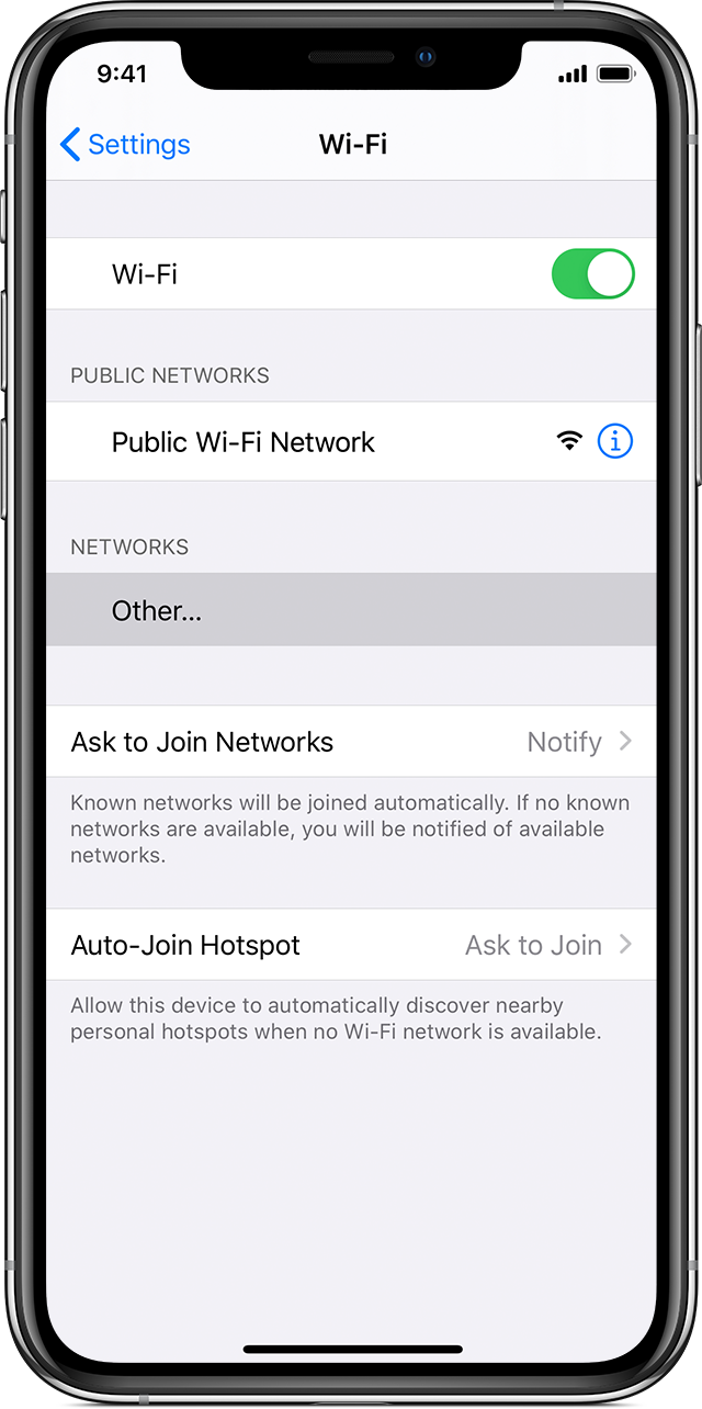 - Go to Settings > Wi-Fi, and make sure Wi-Fi is turned on. Then tap Other.